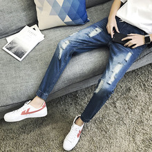 2017春夏新款宽松哈伦裤男破洞八分裤潮流百搭小脚裤弹力牛仔裤男