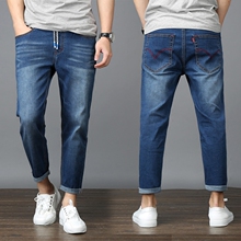 男士加肥加大码系带抽绳松紧腰牛仔裤修身弹力胖人男装显瘦小脚裤