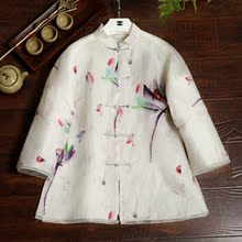 菲伊唐水墨荷花真丝薄羽绒服立领修身显瘦文艺范中长款羽绒外套