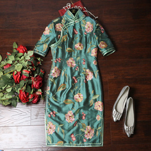 花容月貌夏新款复古立领真丝绣花旗袍改良中长款旗袍裙宴会礼服裙