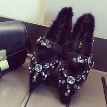 欧美秋冬新款绒面水貂毛皮带扣水钻尖头平底鞋加绒毛毛鞋女单鞋潮
