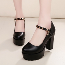 真皮圆头浅口高跟鞋铆钉一字扣带模特鞋超高跟粗跟防水台厚底女鞋