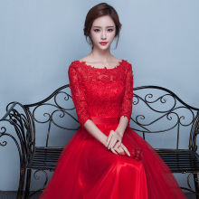 长款敬酒服2017新款红色蕾丝中中袖显瘦新娘结婚晚礼服红色春夏季