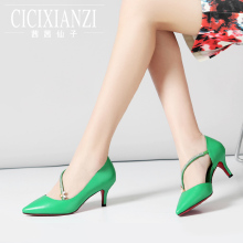 2017春夏新款中空一字扣高跟鞋尖头粗跟单鞋真皮女鞋中跟性感凉鞋
