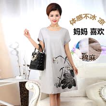 中老年女装连衣裙棉麻大码短袖妈妈装中长款40-50-60岁中年打底衫