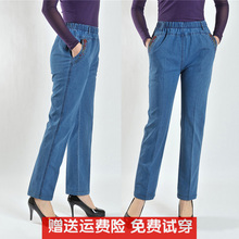春夏中老年牛仔裤女高腰直筒宽松大码加厚中年妈妈松紧腰九分裤薄