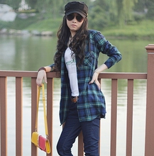 2015春秋新款长袖纯棉格子衬衣女士中长款大码衬衫女修身显瘦打底