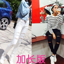 2017夏装韩版新款高腰破洞弹力时尚修身加长牛仔裤超长铅笔裤子女