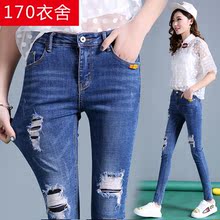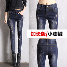 高个子韩版潮高腰加长牛仔裤女破洞大码超长加长版女裤子小脚长裤