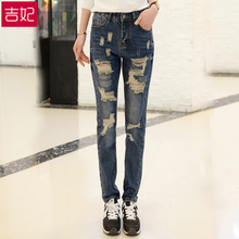 吉妃春秋款韩版破洞牛仔裤女长裤宽松中腰直筒裤潮流洞洞装牛仔裤