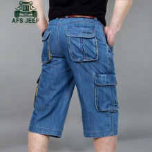 战地吉普男士牛仔短裤男裤宽松大码AFS JEEP牛仔七分裤男士中裤