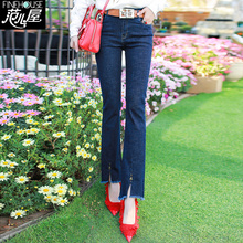 范儿屋女裤2016春季修身牛仔裤直筒韩版中腰微喇裤大码休闲长裤潮