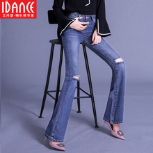 iDance春秋款韩版破洞微喇牛仔裤女绣花款牛仔裤微喇叭裤大码