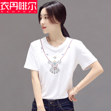 2016夏季新款韩版百搭简约短袖T恤女宽松刺绣卡通上衣圆领纯棉潮