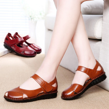 2017夏季妈妈鞋凉鞋真皮软底鱼嘴平底中老年人洞洞鞋女包头女鞋子