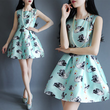 小香风粉色无袖背心公主裙名媛印花蓝色大码高腰蓬蓬连衣裙短裙夏