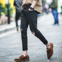 超值包邮韩版街头时髦破洞暗黑牛仔裤潮男黑色修身小脚九分牛仔裤