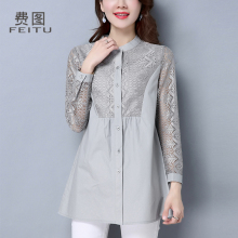 女性女士纯棉中长款衬杉棉长袖女人衬衫女大码女子立领衬衣蕾丝