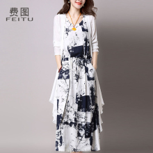 女士印花2件套连衣裙无袖长袖两件套连身裙圆领女子女人连衣裙子