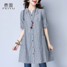 费图夏季新款条纹衬衫女短袖宽松大码中长款衬衣裙简约显瘦棉开衫