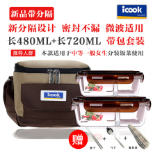 ICOOK新品带分隔耐热玻璃饭盒微波炉专用保鲜盒便当盒碗带包套装