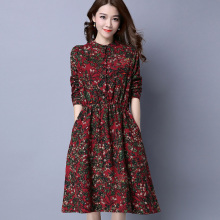 春秋季女装长袖碎花连衣裙收腰显瘦中长款女裙中年妈妈装全棉lyq
