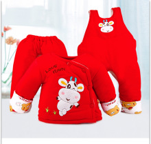 秋冬季新生婴儿纯棉加厚款背带裤棉衣三件套装男女宝宝大红满月服