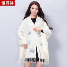 恒源祥秋冬季新款羊毛围巾女民族风刺绣长款加厚超大保暖披肩两用