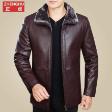秋冬海宁皮衣中年PU皮外套中长款风衣加厚加绒翻领皮夹克男爸爸装