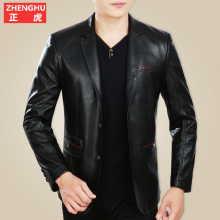 春秋男装男士夹克中年修身西服PU皮西装海宁皮衣纯色薄上装爸爸装