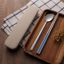 小麦秆304不锈钢餐具 便携旅行筷子勺子创意长柄学生餐具三件套装