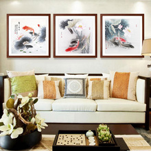 九鱼图装饰画客厅现代中式三联有框装裱国画年年有余荷花墙挂画春