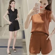 夏装新款无袖蕾丝拼接雪纺衫女装修身T恤韩版短裤子时尚两件套潮