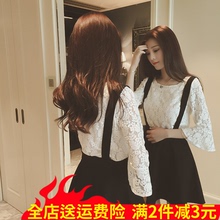春装韩版学院风蕾丝上衣+背带半身裙两件套装连衣裙女