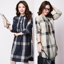 棉麻大码长袖衬衫女士上衣2016春新款格纹中长款文艺印花连衣裙