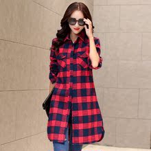 格子衬衫女长袖2016秋装新款女装大码秋季中长款外套上衣棉麻衬衣