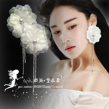 韩国直送白色牡丹花超长闪仙流苏水钻流行925纯银耳环耳夹饰品美