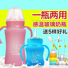 小不点 安全宽口径感温变色玻璃奶瓶+保护套+吸管+手柄正品包邮