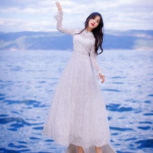 2017夏上新 复古名媛气质蕾丝喇叭长袖连衣裙修身大摆仙女长裙