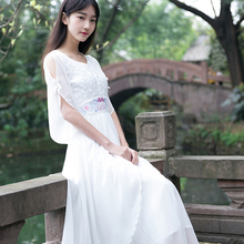 花盈月夏装新款文艺复古名媛蕾丝绣花少女露肩中长连衣裙汉服元素