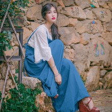 永远的学院派头法式田园草本绣花美好的孔雀蓝色背带阔脚裤