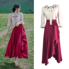 2017夏装新款复古飘带性感衬衫+贵族浪漫红色高腰鱼尾裙半身裙