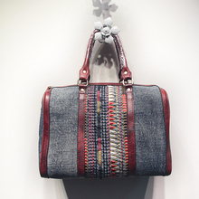 D意志 欧美外贸原单纯手工刺绣牛仔布配皮手提女包高品质气质单肩