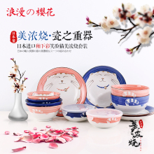 日本美浓烧陶瓷米饭碗手绘卡通笑脸猫双层花纹汤面碗餐具套装6件
