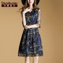 丹慕妮尔2017夏装新款七分荷叶袖印花雪纺连衣裙修身A字裙6088A