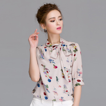 小虫艾米2017夏季新款真丝衬衫女短袖 蝴蝶结百搭印花桑蚕丝衬衣