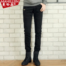 曼哈森2016秋冬韩版加厚加绒修身男士牛仔裤纯黑色牛仔中腰小脚裤