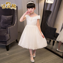 夏季白色一字肩公主裙女童六一生日演出服花童婚纱儿童主持蓬蓬裙