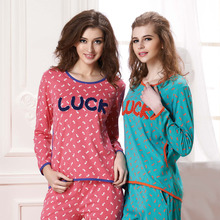 意大莱品牌正品15新款女士全纯棉玫红长袖长裤睡衣家居服秋冬套装