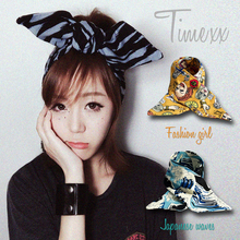 原创 欧美复古印花铁丝宽边兔耳朵蝴蝶结发带 韩国弹力发饰发箍潮